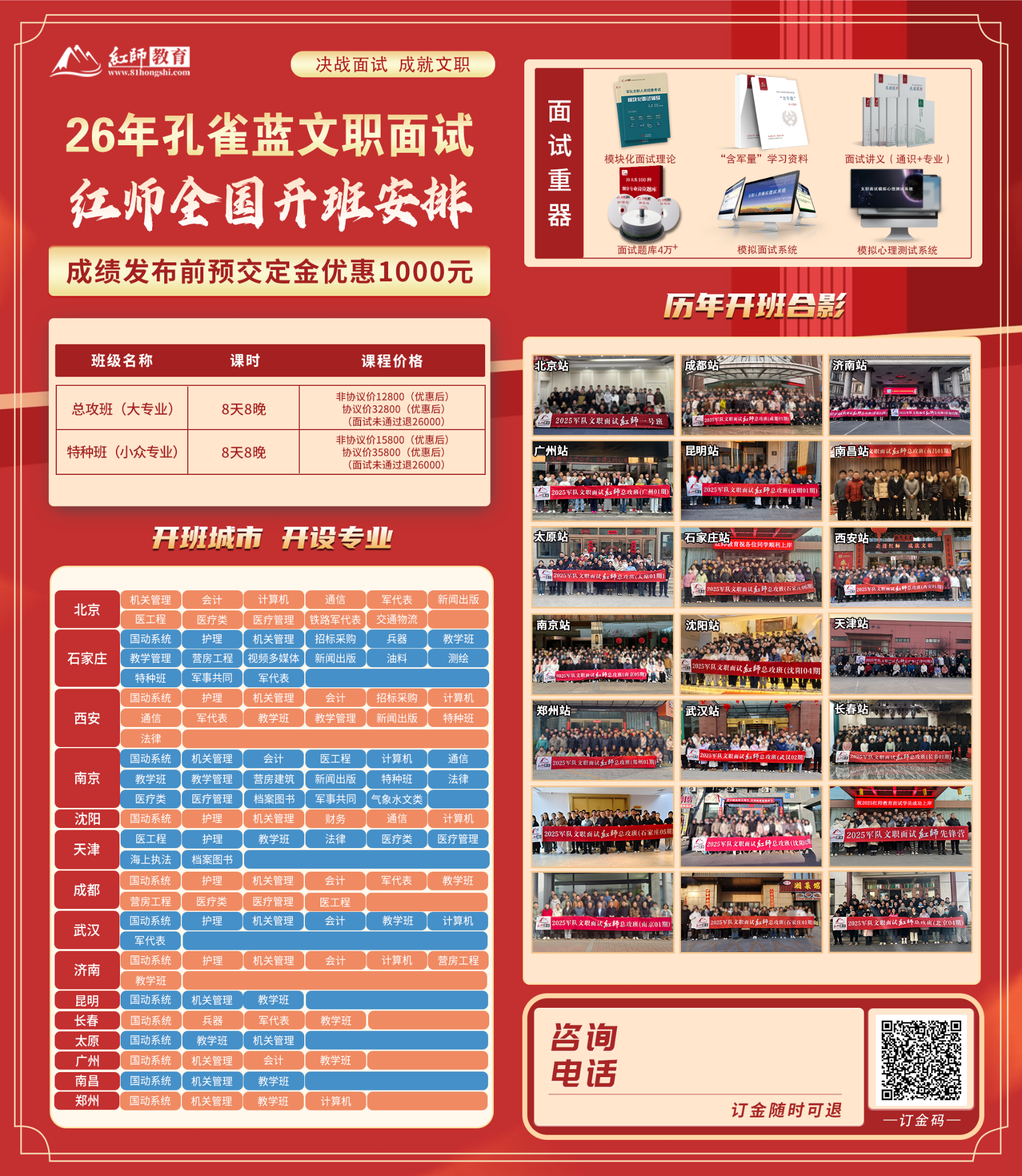紅師教育2026年軍隊(duì)文職面試線下班全國(guó)安排來(lái)啦!