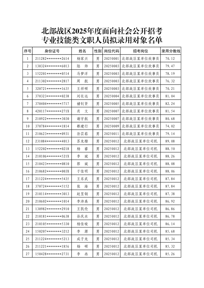 原文標(biāo)題:公示北部戰(zhàn)區(qū)2025年度面向社會(huì)公開招考專業(yè)技能類文職人員擬錄用對(duì)象名單
