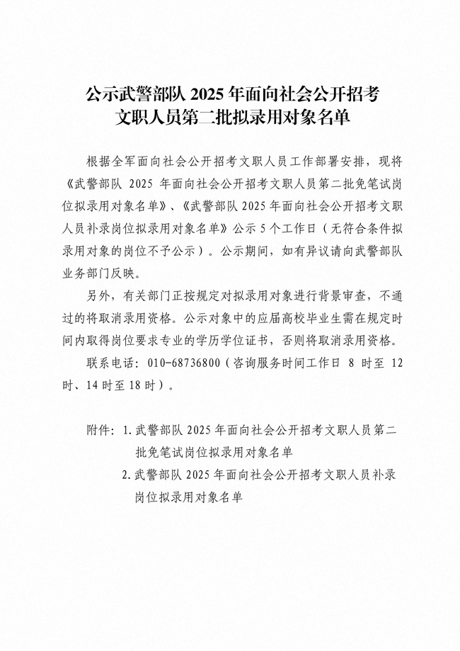 原文標(biāo)題:公示武警部隊2025年面向社會公開招考文職人員第二批擬錄用對象名單