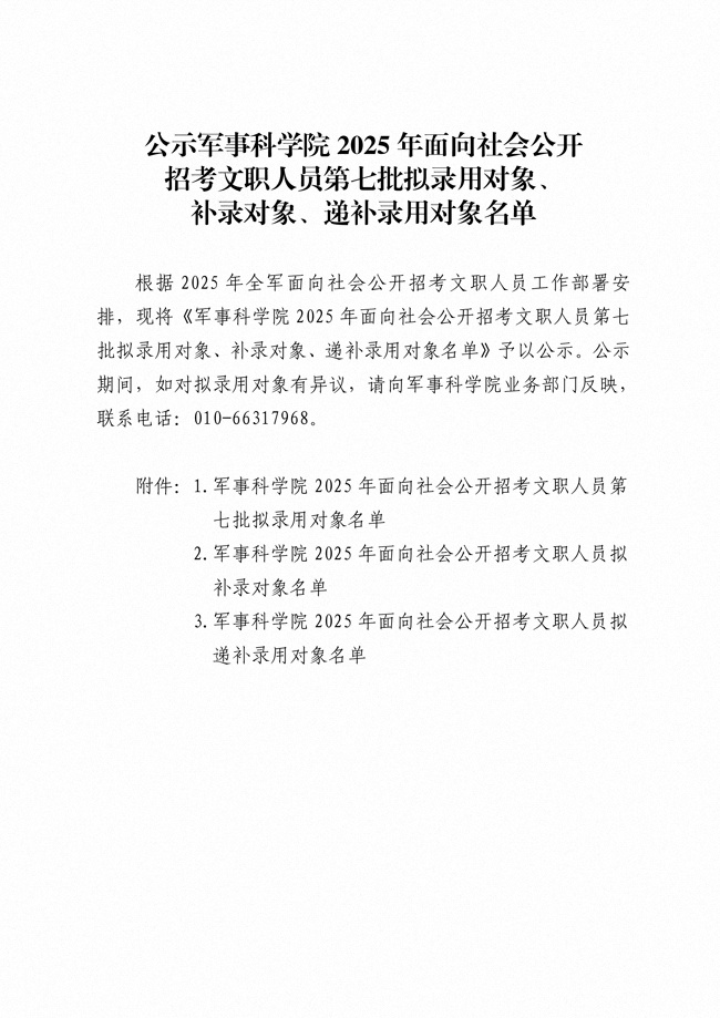 原文標題:公示軍事科學(xué)院2025年面向社會公開招考文職人員 第七批擬錄用對象、補錄對象、遞補錄用對象名單