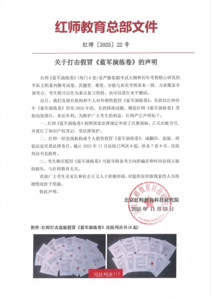 因?yàn)樗{(lán)軍卷質(zhì)量和口碑都很好,每年臨近筆試備考沖刺階段是時(shí)候,藍(lán)軍卷就會(huì)爆單。巨大的需求量,也引來了盜版販子非法牟利。在此提醒廣大考生:盜版只會(huì)是你進(jìn)面的絆腳石!
