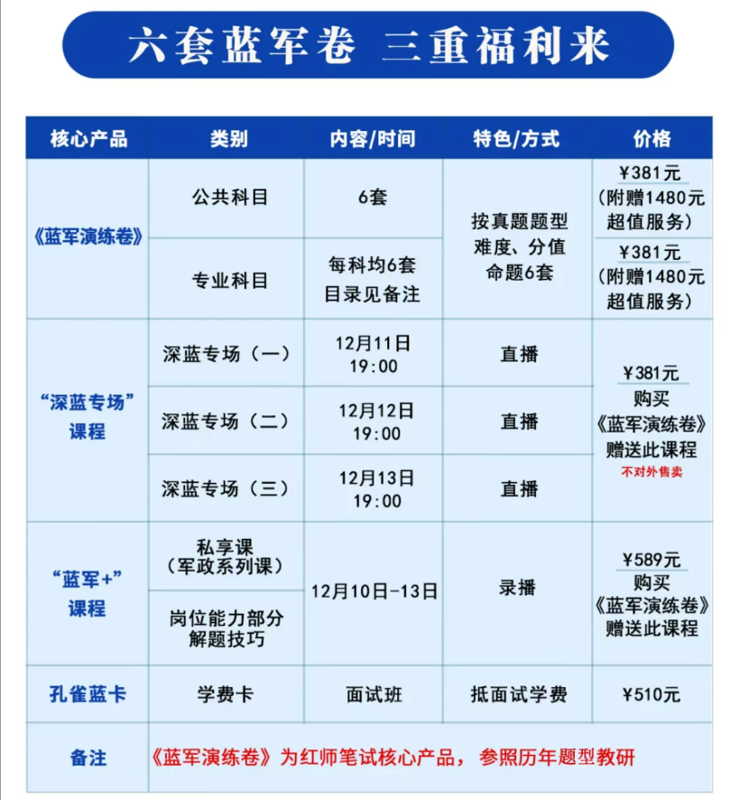 也許同學(xué)們沒有關(guān)注《藍(lán)軍演練卷》的詳細(xì)介紹,該套試卷不僅包括了6套模擬試卷,還有“《深藍(lán)專場》”課程、“藍(lán)軍+”課程、孔雀藍(lán)卡510元的面試代金券!