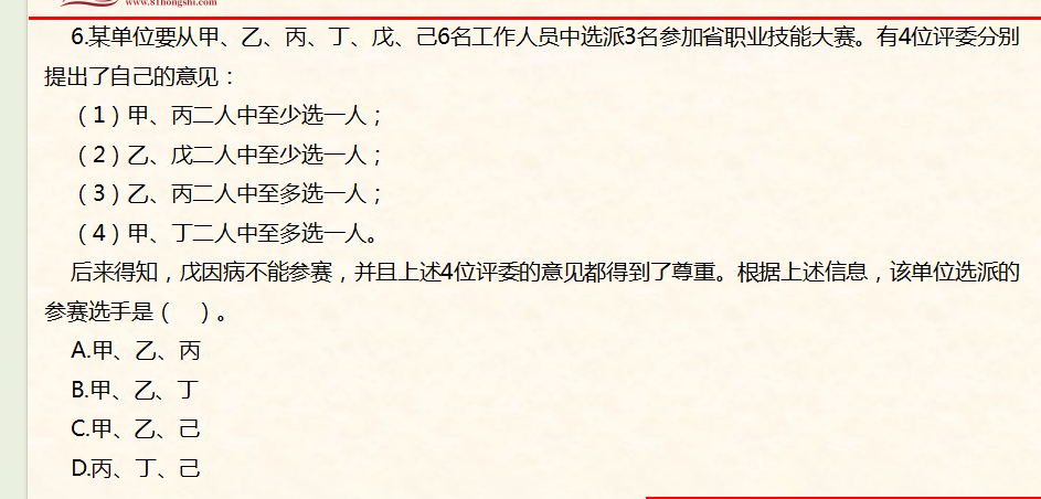 (3)若戊、己都入選,則甲不能入選。以下人員組成不符合要求的是( )。