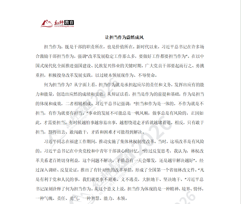 擔當作為,既是干部的職責所在,也是價值所在。新時代以來,習近平總書記在許多場合激勵干部擔當作為,強調(diào)"改革發(fā)展穩(wěn)定工作那么多,要做好工作都要擔當作為"。在以中國式現(xiàn)代化全面推進強國建設、民族復興偉業(yè)的關(guān)鍵時期,廣大黨員干部要起而行之、勇挑重擔,積極投身改革發(fā)展實踐,以過硬本領(lǐng)展現(xiàn)作為、不辱使命。