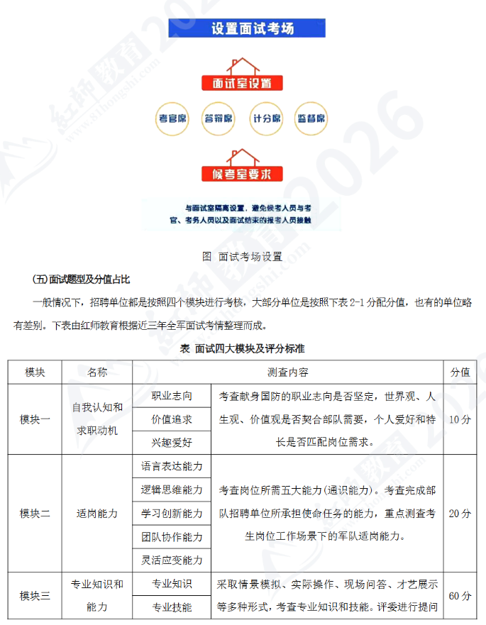 在軍隊(duì)文職面試工作中,招聘單位特別注重考生的實(shí)際工作能力,通常會(huì)將情景模擬和實(shí)際操作考核作為面試考核的重點(diǎn)(見圖)。比如,管理崗位注重考核考生的靈活應(yīng)變能力;專業(yè)技術(shù)崗位重點(diǎn)考核試講、說(shuō)課;醫(yī)護(hù)類崗位重點(diǎn)考核護(hù)理操 作;文體類崗位重點(diǎn)考核才藝展示等。