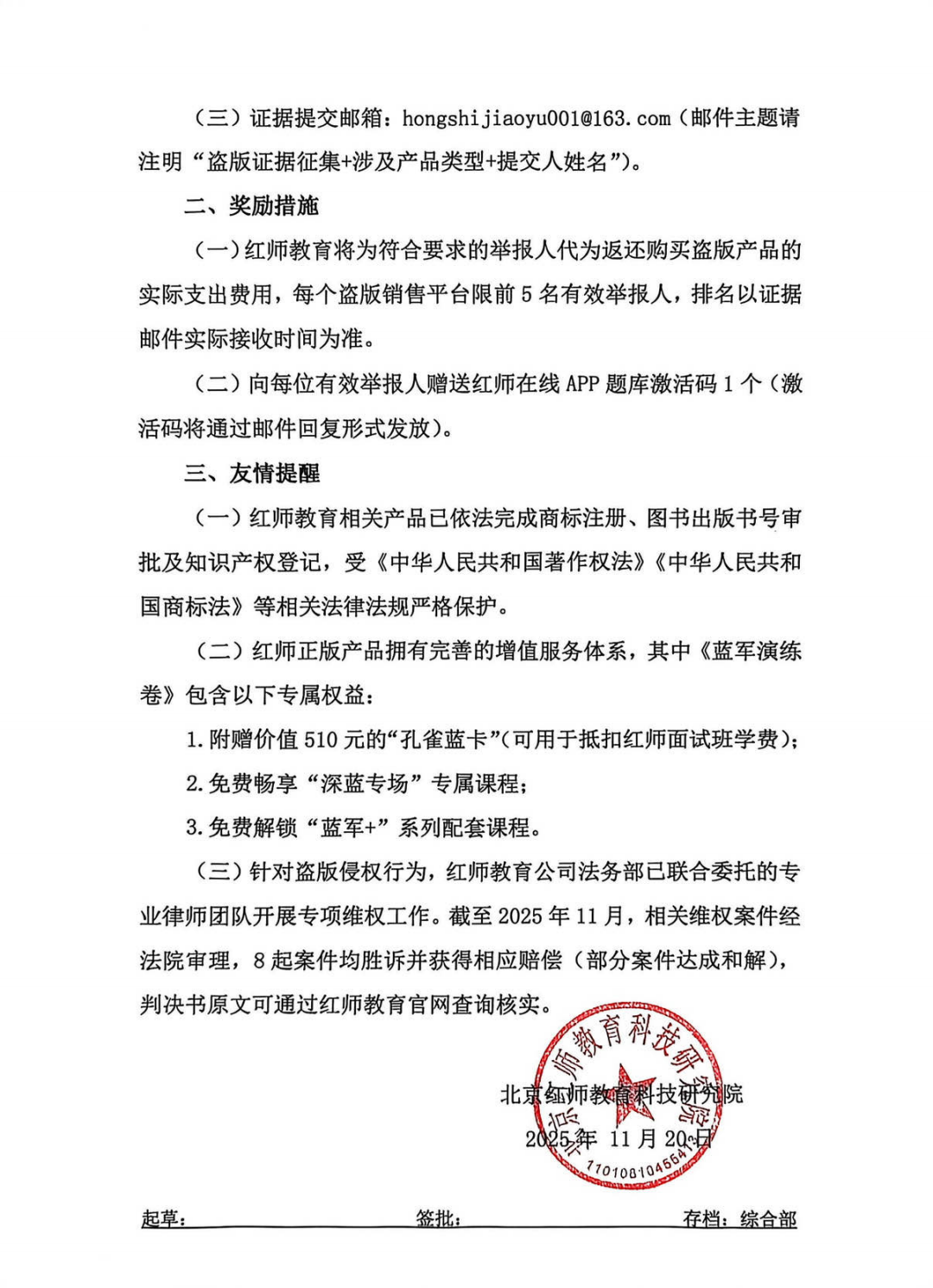 紅師教育丨關(guān)于有獎(jiǎng)?wù)骷I版侵權(quán)相關(guān)證據(jù)的公告 2025-11-25