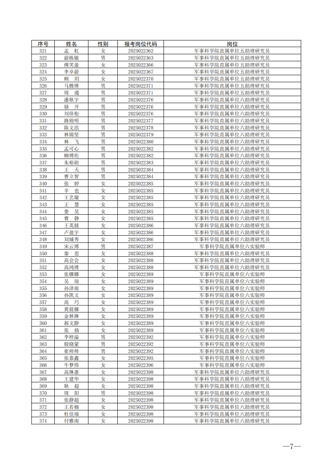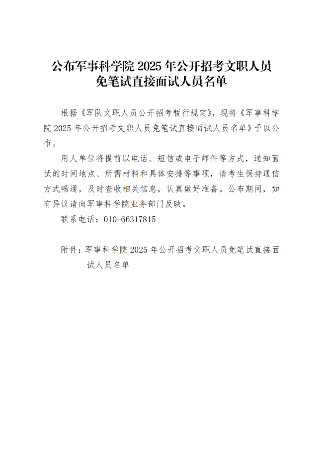 原文標題:公布軍事科學院2025年公開招考文職人員免筆試直接面試人員名單