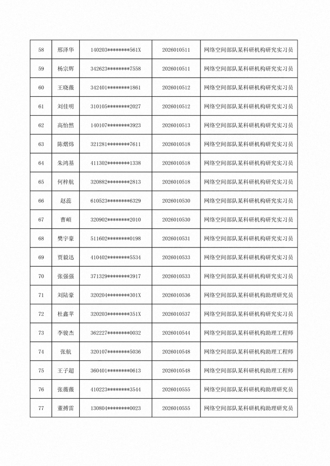 原文標(biāo)題:公布網(wǎng)絡(luò)空間部隊(duì)2026年公開招考文職人員第一批免筆試直接參加面試人員名單