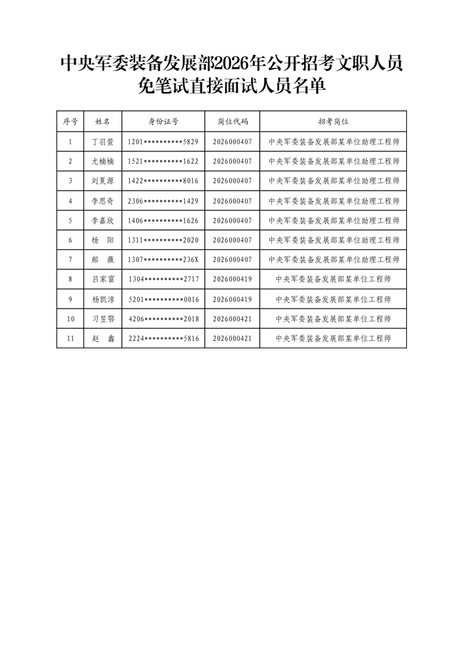 原文標題:公示中央軍委裝備發(fā)展部2026年公開招考文職人員免筆試直接面試人員名單